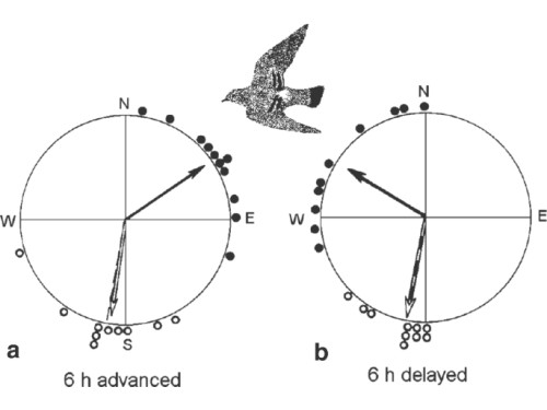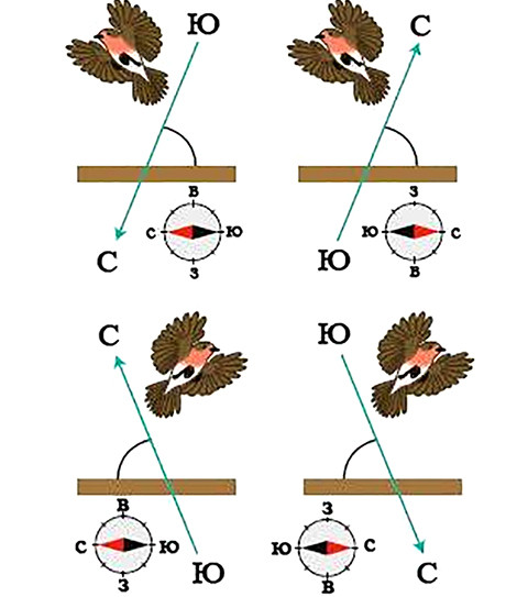 Вернемся к магнитному компасу птиц. В своем эксперименте Вильчко изменили вертикальную составляющую магнитного поля из положения «вниз», присущего северному полушарию, в положение «вверх». При изменении вертикальной составляющей прибор со стрелкой продолжает указывать на север, однако птицы выбирают противоположное ориентационное направление. Дело в том, что стрелка туристического компаса представляет собой простой магнит, концы которого притягиваются к разноименным полюсам магнитного поля Земли. Однако магнитный компас перелетных птиц чувствителен не к полярности магнитного поля, а к углу вхождения силовых линий магнитного поля относительно поверхности Земли. Иначе говоря, перелетные птицы не могут отличить магнитный юг от магнитного севера — для птиц важно направление «к магнитному полюсу» и к «магнитному экватору» (рис. 2) [6].